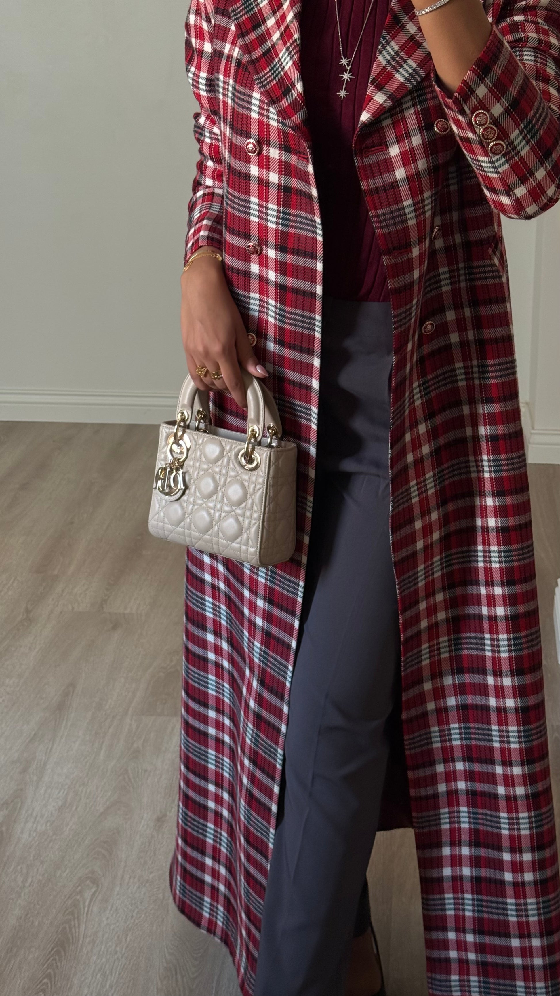 معطف طويل بنقشة كاروهات كلاسيكية بدرجات الاحمر و الأسود ، مزوّد بأزرار ذهبية مميزة. مستوحى من أناقة الريف الأوروبي، ومصمم ليمنحك حضوراً واثقاً ومترفاً في الأيام الباردة.