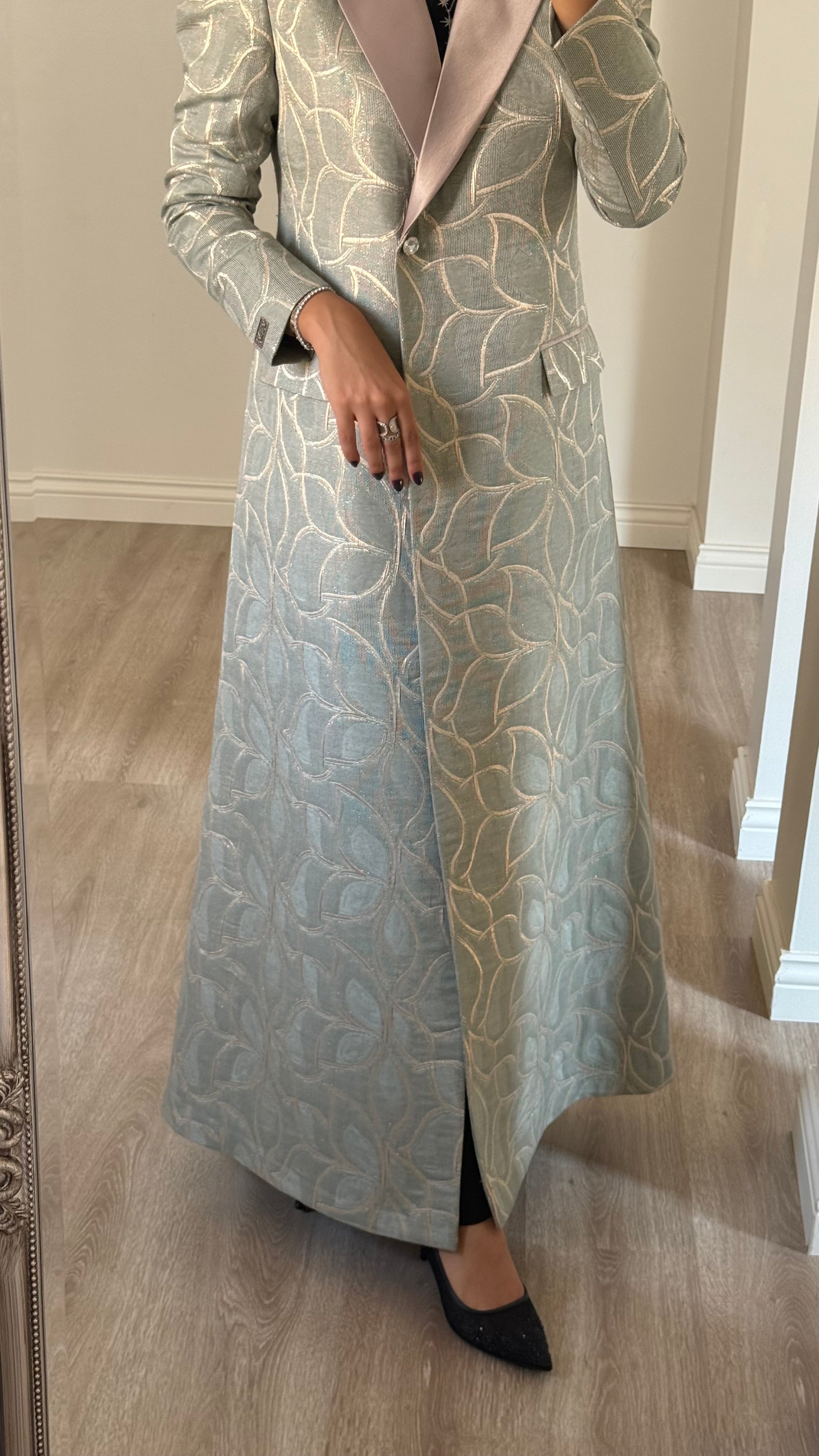 بليزر بقماش جاكار تيفاني مزخرف بنقشة أوراق بارزة بخيوط ذهبية، يمنح القطعة فخامة وتأثير ثلاثي الأبعاد.